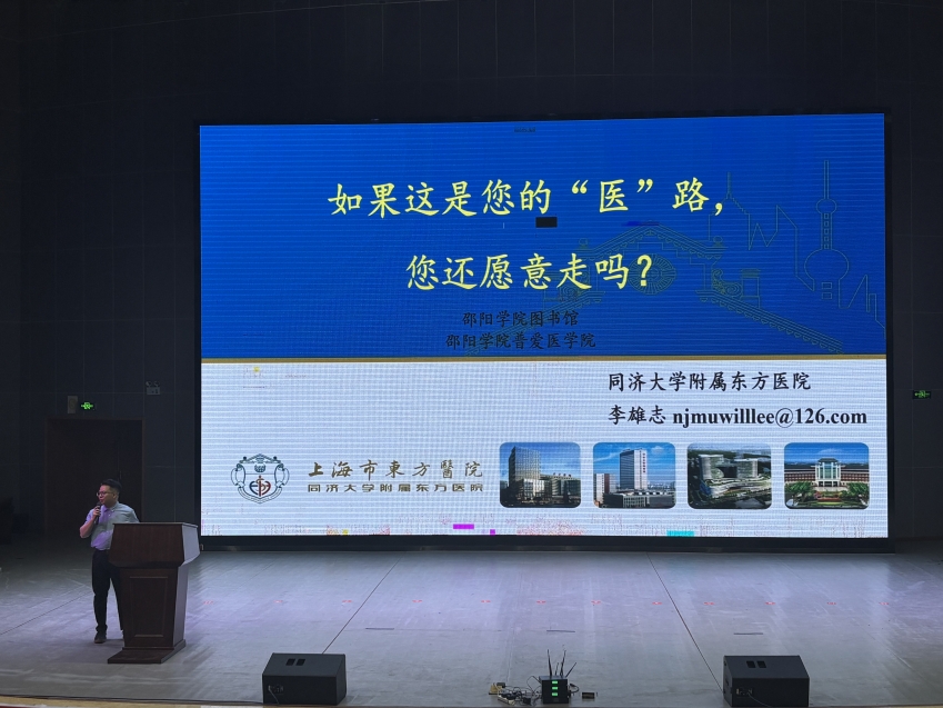 10月17日晚7时,邵阳学院图书馆与普爱医学院在图书馆报告厅联合举办了主题为 “如果这是您的‘医’路,您还愿意走吗?”专题讲座。本次活动特邀同济大学附属东方医院主治医师、在站博士后李雄志担任主讲。李雄志博士以平实的语言,向听众讲述了其不畏艰难、执着追梦的求学经历,以其自身真实历程为蓝本,生动诠释了一名医者的成长轨迹,将“医路”之上的困惑、抉择、坚守与收获等心路历程一一呈现。为在场学子描绘了一幅富有感染力与启发性的职业图景,助力医学生坚定从医信念、明晰职业方向,引导其深入思考医学事业的价值与使命,砥砺医者品格。