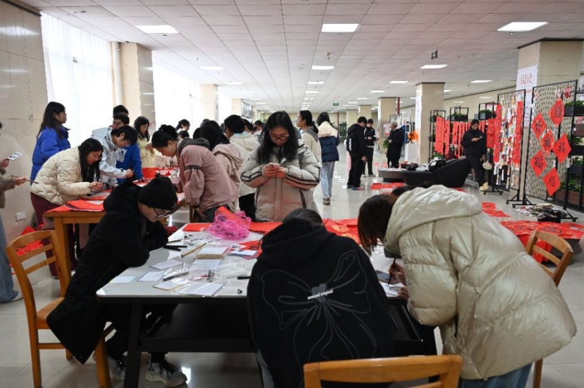 活动设置三大特色体验区,吸引师生踊跃参与。“粘土娃娃DIY”区,师生用超轻粘土捏塑灯笼、福字、元宝等吉祥物件,在创作中寄托新年美好期许;“漆扇制作”区,大家领取空白扇面,或书写祝福、或绘制心仪图案,经上漆处理呈现独特纹理色彩,成品收获一致好评;“书写祝福”与“时间胶囊”区人气高涨,活动特邀王忠民博士、邓新影副教授现场为师生送对联、赠福字,同学们或执笔写下新年愿望与规划,或将美好祝福封存,寄送给来年的自己。